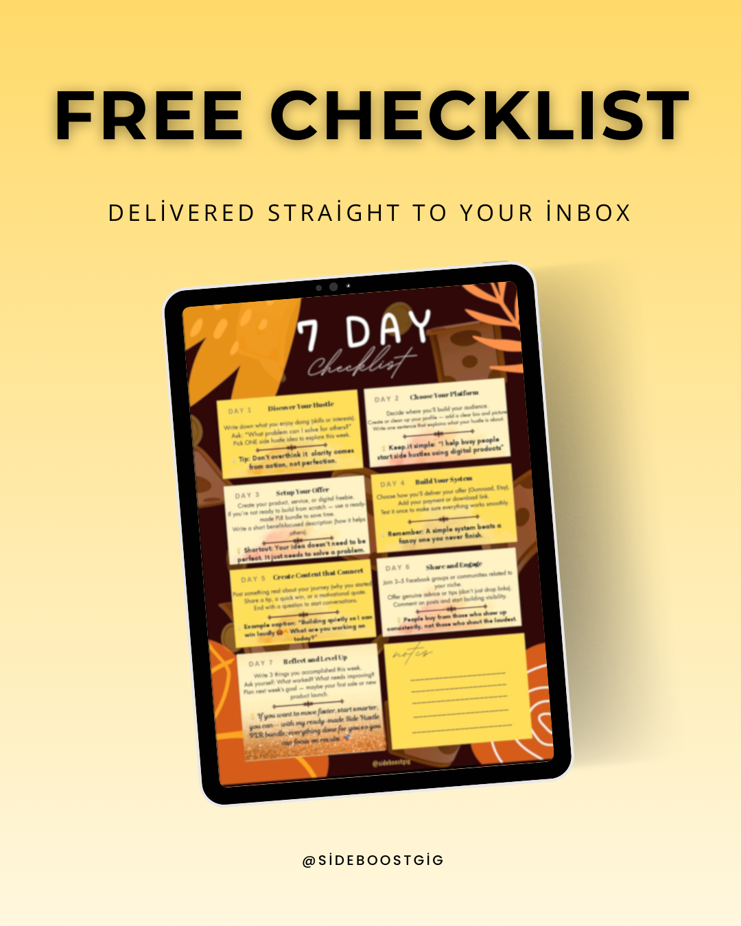 Free 7-Day Side Hustle Checklist – Kickstart your side hustle with a step-by-step guide for your first week. Plan, launch, and take action with easy daily steps to turn your idea into a thriving side business. This beginner-friendly guide breaks your week into simple daily steps so you can finally start the side hustle you’ve been thinking about—even if you have no experience.